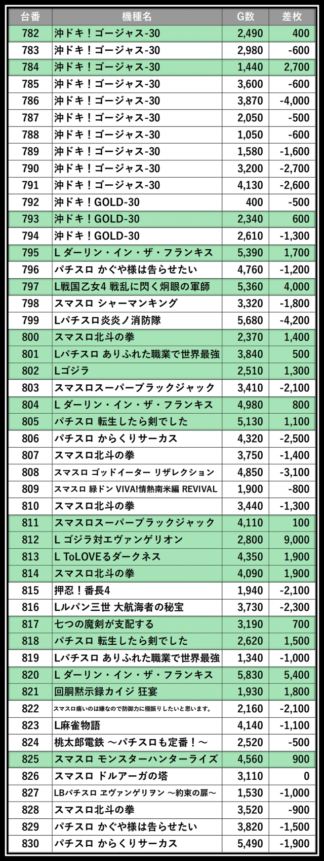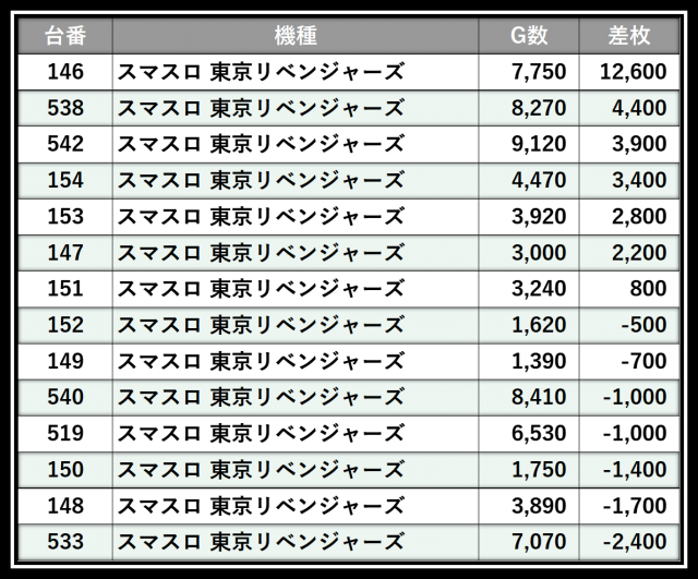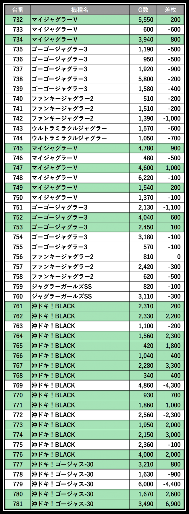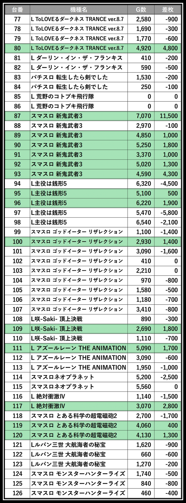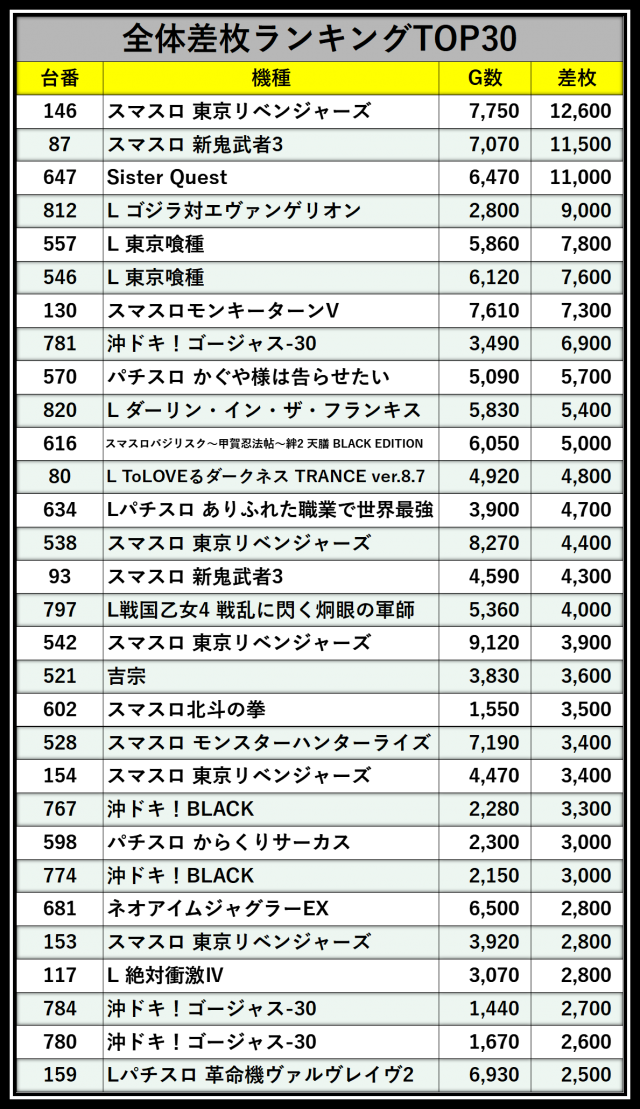 ※差枚数順に掲載しています