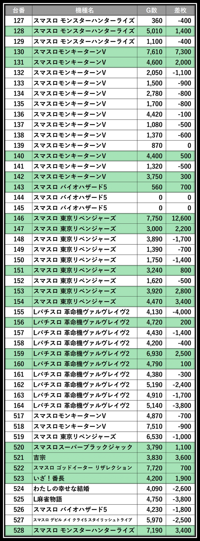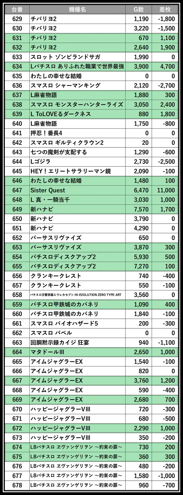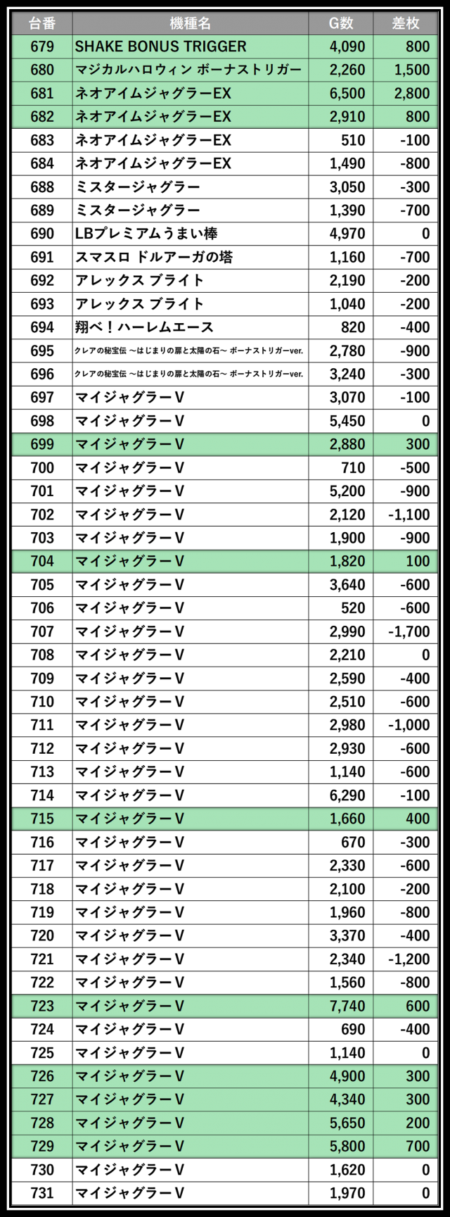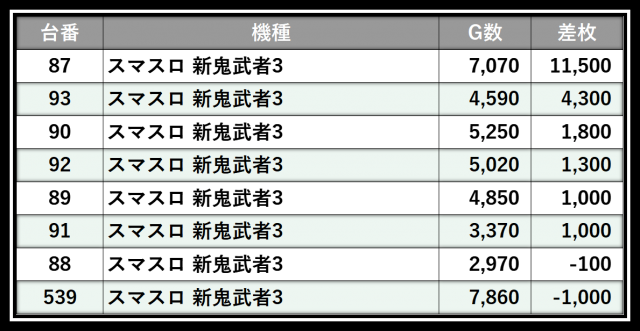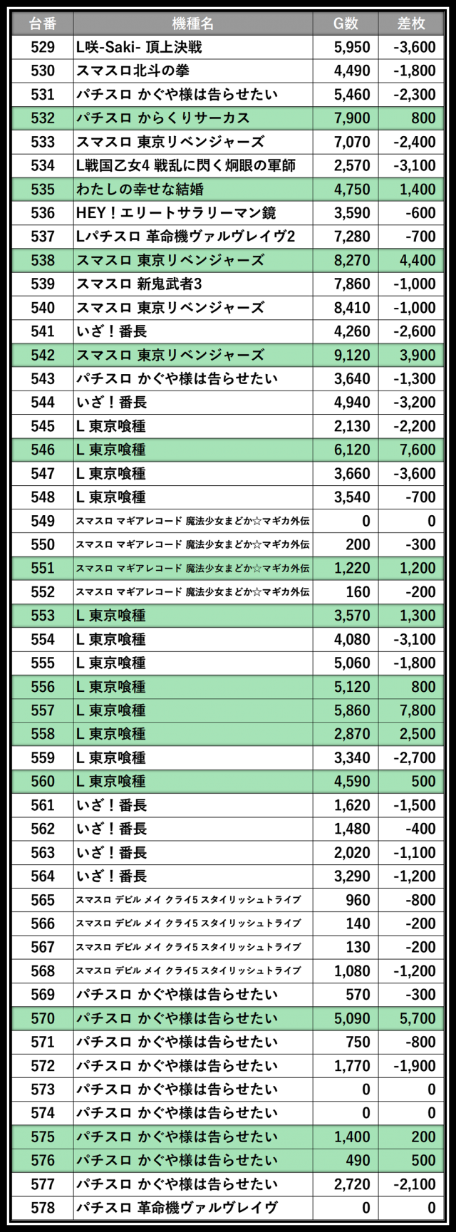 ※差枚数順に掲載しています
