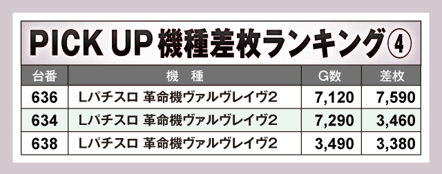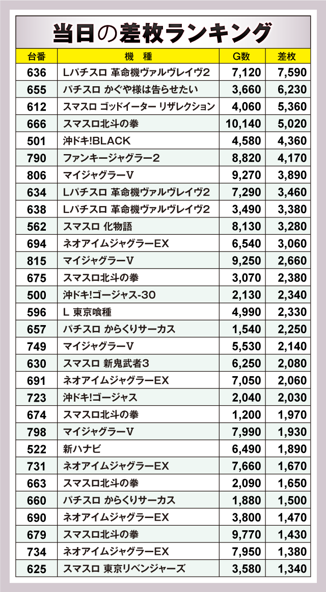 この日、最もプレイヤーの注目を集めたのが『Lパチスロ 革命機ヴァルヴレイヴ2』で、636番台が+7,590枚を叩き出しランキングトップに。しかも、その他の台からも+3,000枚超が2台も飛び出す盛況ぶりを披露しファンを喜ばせていた。また、ジャグラーシリーズも大奮闘しており、差枚TOP30に10台がランクインする見事な結果を残している。