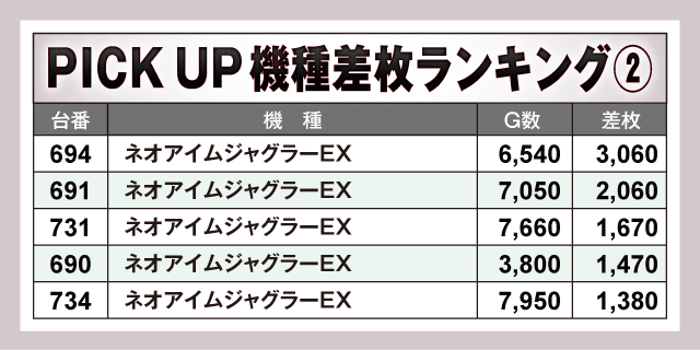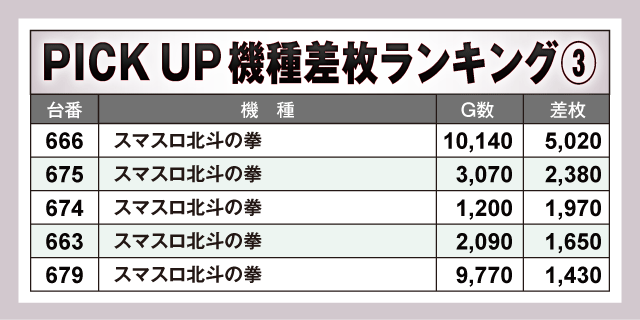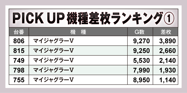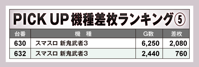 続いてPICK UP機種の状況をチェック!! ランキングを制した『Lパチスロ 革命機ヴァルヴレイヴ2』以外からもハイスコアが続出しており、『スマスロ北斗の拳』からは+5,020枚、『スマスロ 新鬼武者3』と『L 東京喰種』からは+2,000pt超が発生。さらに、『マイジャグラーⅤ』が+3,890枚、『ネオアイムジャグラーEX』が+3,060枚を記録するなど、2つのジャグラーシリーズからも多数の好調台が確認されている。