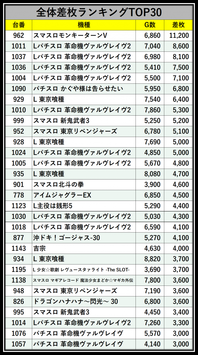 初開催となった今回の「極誓取材」はスマスロ勢が差枚ランキングの主役となり、終日高稼働を維持する展開に。とくに『Lパチスロ 革命機ヴァルヴレイヴ2』は複数台が上位に食い込み、機種全体としても抜群の存在感を放っていた。一方で『L 東京喰種』や『ススマスロモンキーターンV』といった人気AT機も安定した差枚を積み重ね、ホール全体の底上げに貢献。さらに『ジャグラー』シリーズや『ハナハナ』シリーズからも好結果が確認でき、タイプを問わずチャンスが散らばる一日となった。この流れが加速すれば、次回はさらにインパクトある結果も期待できそうだ!