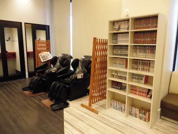 レストコーナーには多くの漫画本が用意されているほか、マッサージチェアを利用できるなど、充実した設備が揃っている。