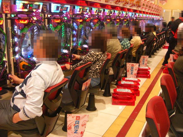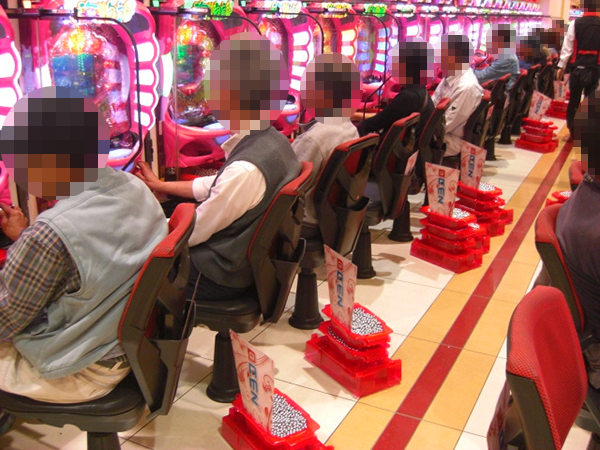 13時半過ぎの4円パチンコでは、「CRヱヴァンゲリヲン 2018年モデル」や「CRスーパー海物語IN沖縄4」が活況。さらに「ぱちんこCR真・北斗無双」のシマも微笑ましいムードに包まれていた。