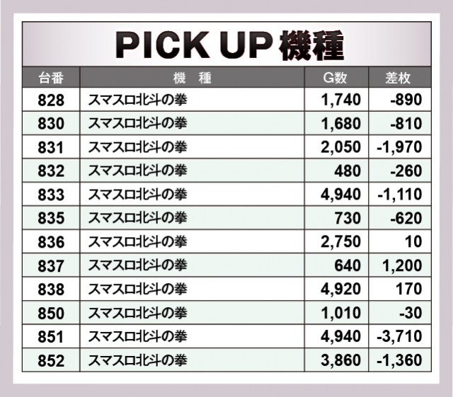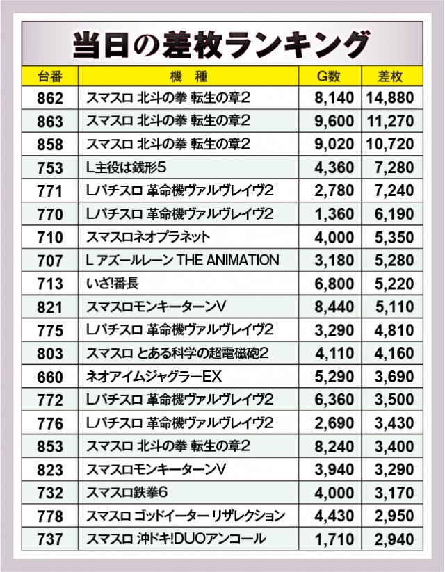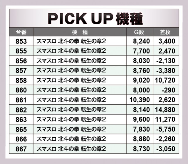 最も強いインパクトを残したのは『スマスロ 北斗の拳 転生の章2』。高G数・高差枚台が複数確認でき、単発的なヒットではなく島全体で試されていた印象が強い。また『スマスロモンキーターンV』も差枚プラス台がしっかり打ち込まれており、ユーザーが粘った結果が数字に反映された形だろう。