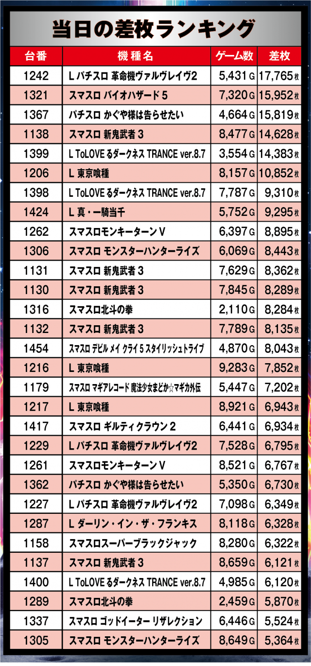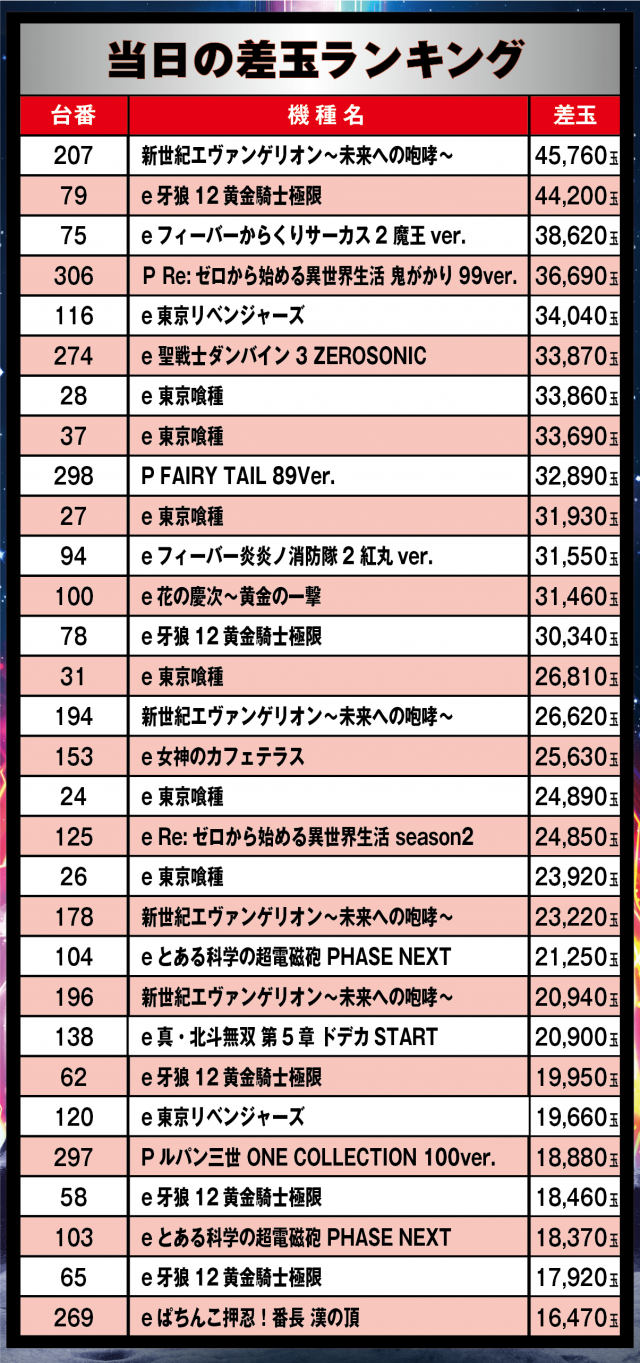 当日のパチンコ差玉ランキング