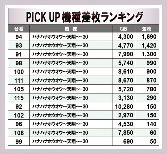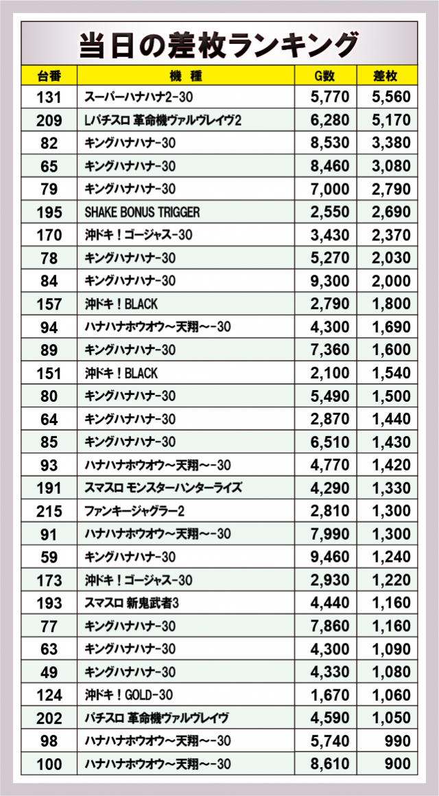 沖縄らしさ全開のランキング構成となった上表の2機種。『キングハナハナ-30』は30台ランキングに多数ランクインし、7,000~9,000G級の高稼働台が安定して差枚を積み上げた。一方『ハナハナホウオウ~天翔~-30』も万回転台を筆頭に高回転で粘られた台が目立ち、腰を据えた立ち回りが結果に直結した形だ。30台ランキングに複数台が名を連ねた点からも、沖スロを軸にした立ち回りがこの日の正解だったことがうかがえる。