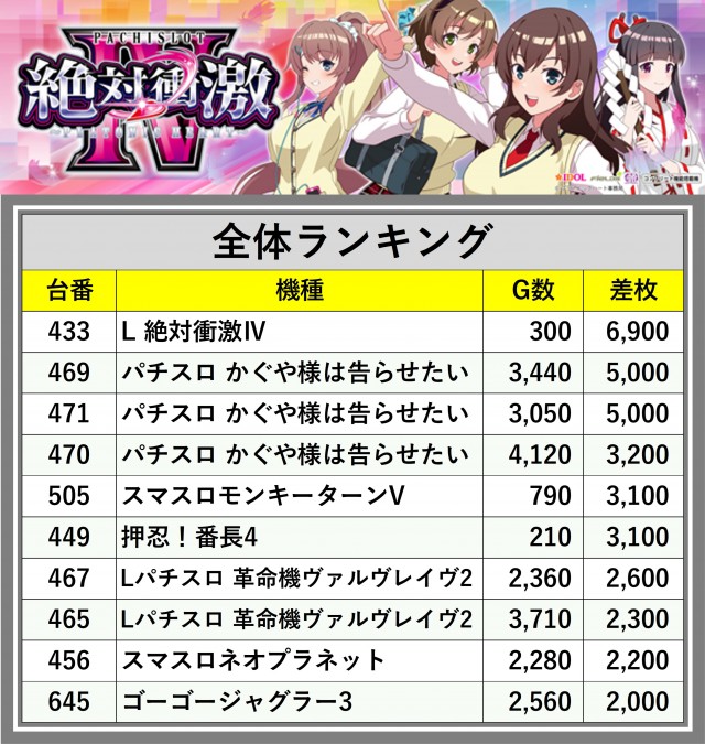 厳選された取材対象機種をはじめ、その他スロット全体から好記録が飛び出した!プレイヤーが楽しんだ1日を下記データにて振り返ってみて欲しい。