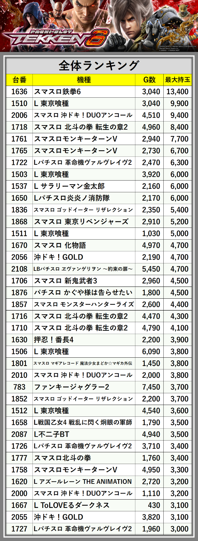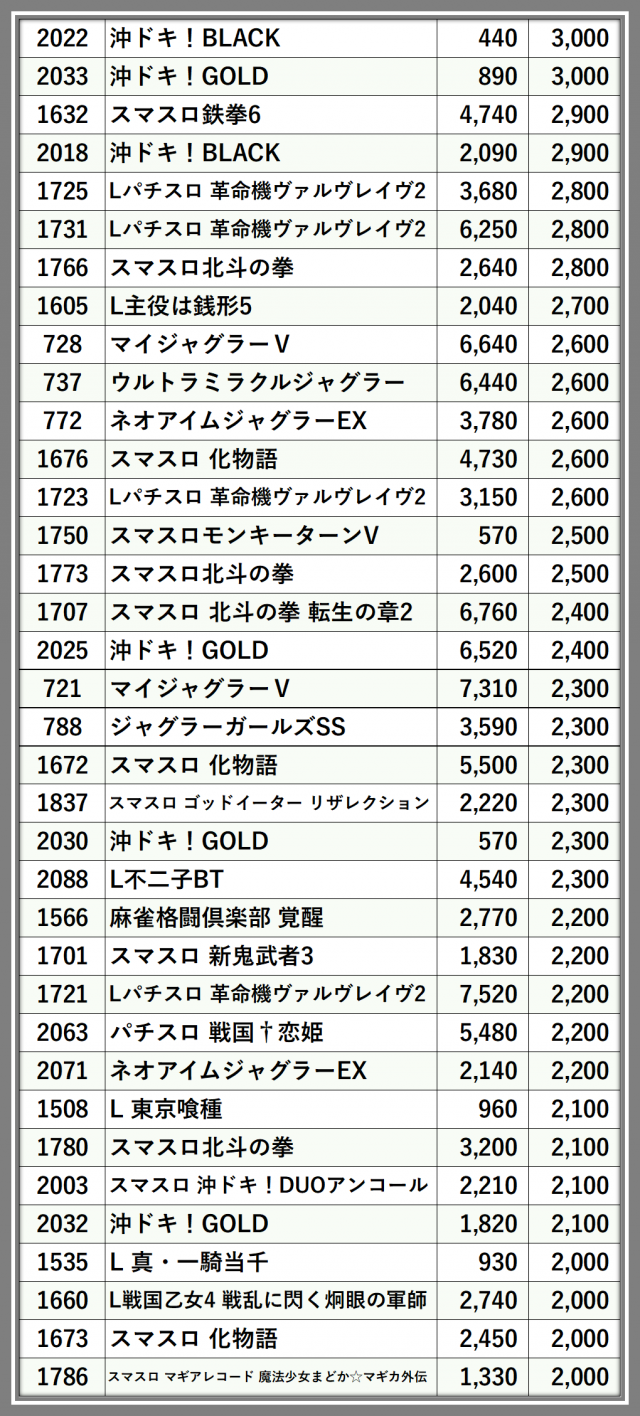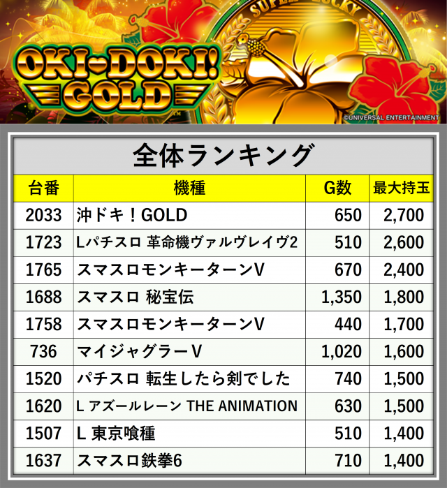厳選された取材対象機種をはじめ、その他スロット全体から好記録が飛び出した!プレイヤーが楽しんだ1日を下記データにて振り返ってみて欲しい。