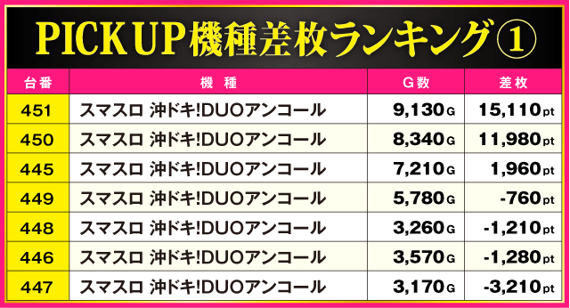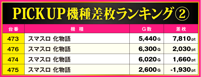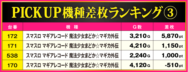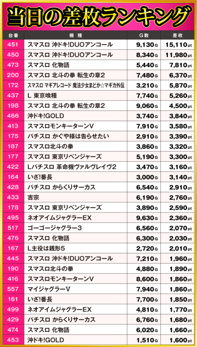 今回のPICK UP機種は全3機種。ハイスコアが飛び出した『スマスロ 沖ドキ!DUOアンコール』と『スマスロ 化物語』以外にも『スマスロ マギアレコード 魔法少女まどか☆マギカ外伝』から+5,870ptを確認。さらに、3機種トータルの全15台中9台がプラス差枚となっているだけに、ファンにとって充実の一日となったのは間違いないだろう。