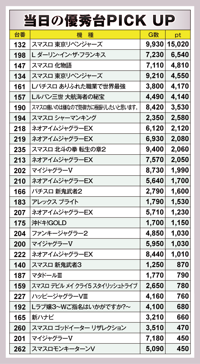 飛びぬけて目立っていたのは『スマスロ 東京リベンジャーズ』。132番台が+15,020ptと圧倒的な成績をおさめていた。少し離れて『L ダーリン・イン・ザ・フランキス』198番台が+6,540pt、『スマスロ 化物語』147番台含む4台が4,000ptオーバーでつづく。さらに『スマスロ痛いのは嫌なので防御力に極振りしたいと思います。』190番台の+3,530ptなど、プレイヤーも大満足の結果がズラリと並んでいた。