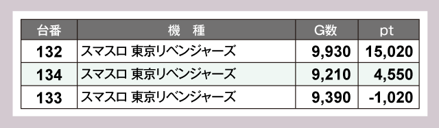 『スマスロ 東京リベンジャーズ』は全台が9,000G超えの高稼働で、1万ptオーバー含む超優秀台が2台誕生していた。