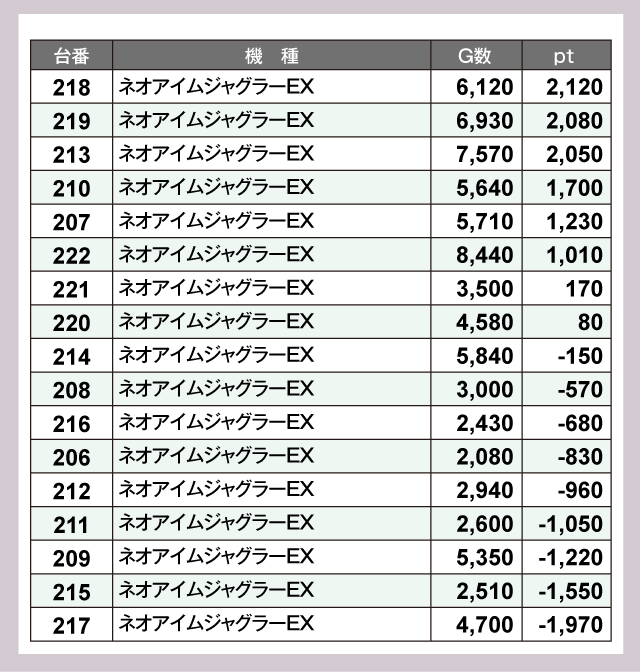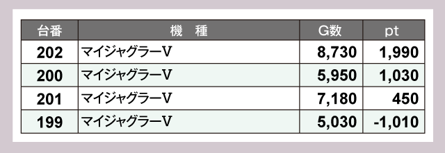 『ジャグラー』シリーズから『マイジャグラーⅤ』と『ネオアイムジャグラーEX』をピックアップ。いずれもかなりのG数が回されていて、pt的にもバツグンの安定感を発揮している。