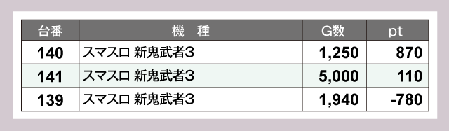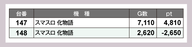 『スマスロ 化物語』はしっかり回された147番台が4,000ptを突破。『スマスロ 新鬼武者3』は若干、G数が物足りず次回以降に期待したいところだ。