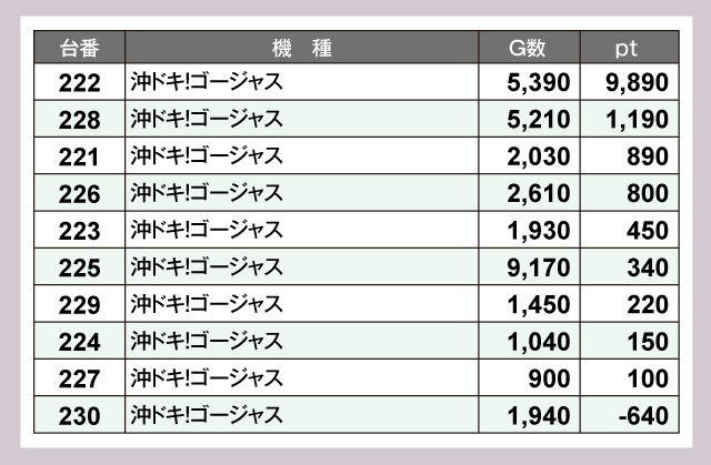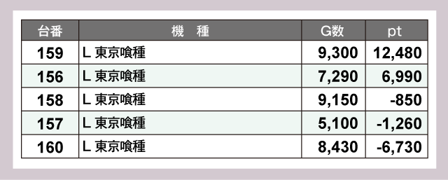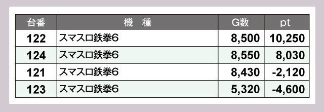 『L 東京喰種』159番台が+12,480pt、『スマスロ鉄拳6』122番台が+10,250ptと、1万ptオーバーが2台誕生していた。そこに『沖ドキ!ゴージャス』222番台が+9,890ptと惜しくも大台届かずの好成績でつづく。さらに『パチスロ かぐや様は告らせたい』183番台が+8,850pt、『スマスロ ゴッドイーター リザレクション』141番台が+8,090pt、『スマスロ鉄拳6』124番台が+8,030ptで追随。以下『スマスロ 沖ドキ!DUOアンコール』219番台の+7,470ptなどなど、驚異的な成績がギッシリ詰まっていた。