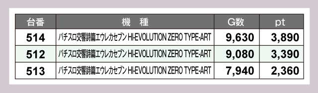 『沖ドキ!ゴージャス』は10台中9台がプラスptと安定感バツグン。3台設置の『パチスロ交響詩篇エウレカセブン HI-EVOLUTION ZERO TYPE-ART』は全台がプラスptと、こちらも素晴らしい打率を誇っていた。
