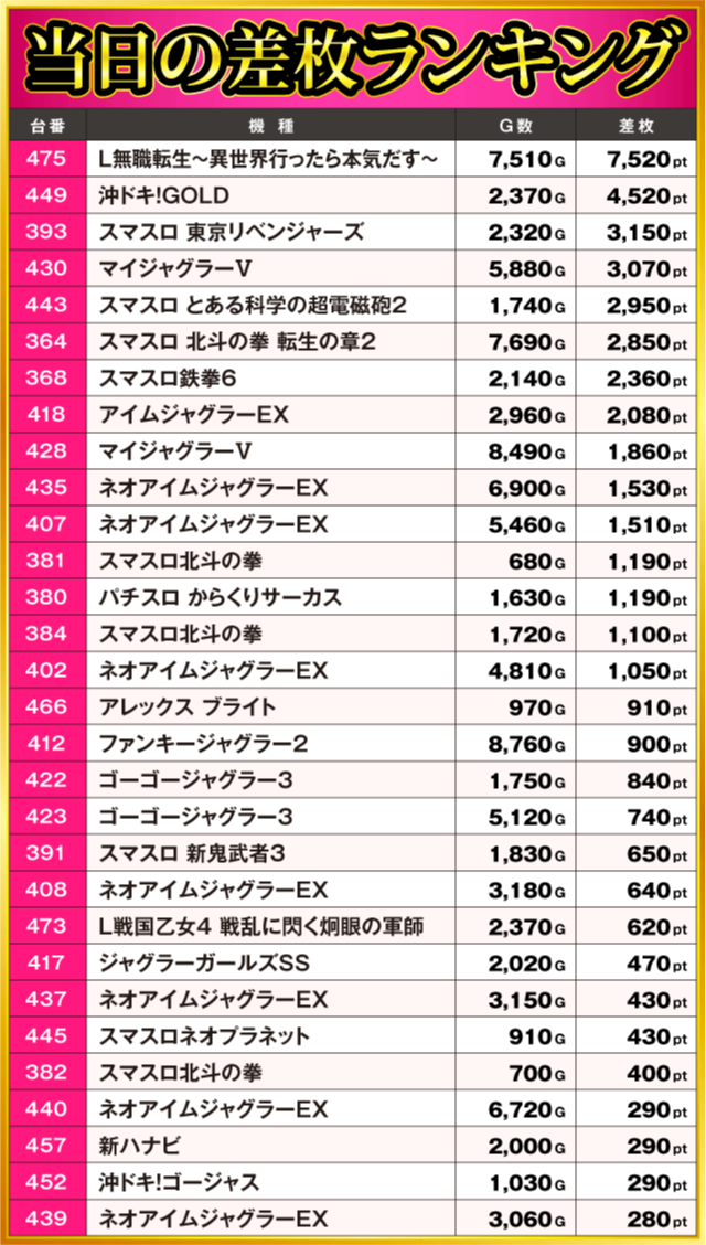 この日は、『L無職転生~異世界行ったら本気だす~』が+7,520ptを叩き出しランキングトップに。次いで、『沖ドキ!GOLD』が+4,520pt、『スマスロ 東京リベンジャーズ』が+3,150ptを記録している。さらに、ジャグラーシリーズも大奮闘しており、差枚TOP30に14台がランクインする勢いを見せファンを喜ばせていた。