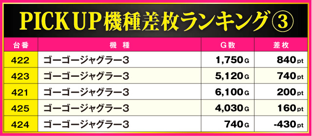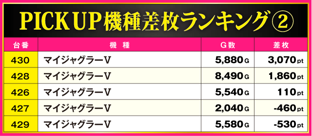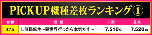 次にPICK UP機種の状況を見ていくと、ランキングを制した『L無職転生~異世界行ったら本気だす~』以外に、『マイジャグラーⅤ』と『ゴーゴージャグラー3』からも多数の好調台を確認。ジャグラーシリーズならではの安定感を遺憾なく発揮し、最終的に両機種合わせた全10台中7台がプラス差枚となる見事な結果を残している。