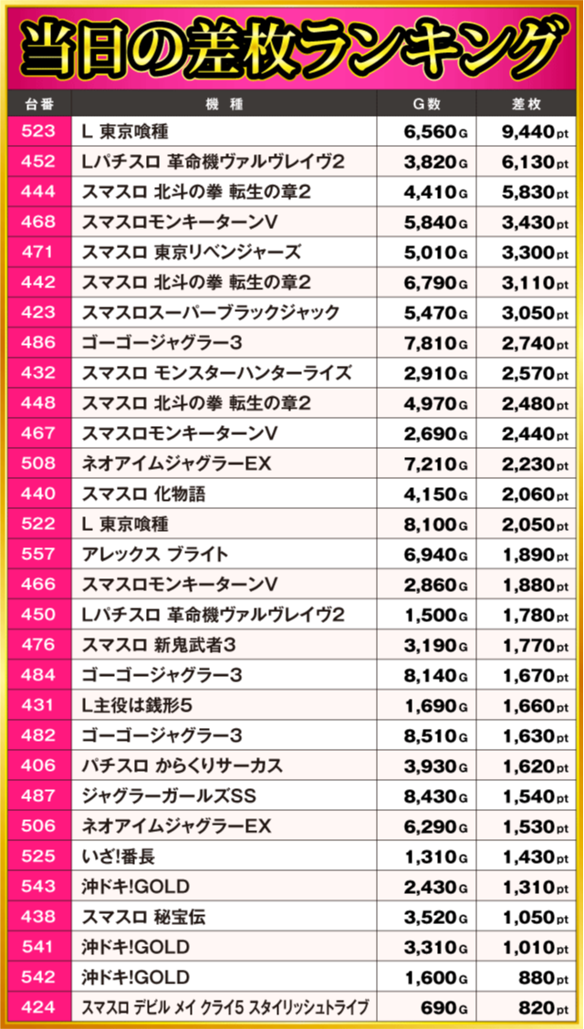 当日の差枚ランキング