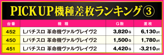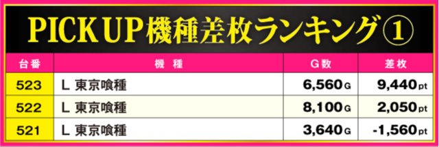 続いてPICK UP機種の状況をチェック!! ハイスコアが飛び出した『L 東京喰種』と『Lパチスロ 革命機ヴァルヴレイヴ2』以外に『ゴーゴージャグラー3』からも多数の好調台が確認されている。486番台の+2,740ptを筆頭に半数の台がプラス差枚となっているだけに、AT機ファンだけでなくAタイプファンも充実の一日となったに違いないだろう。