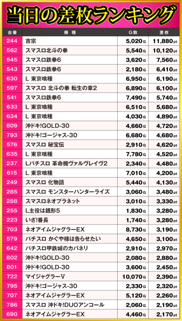 この日は、『吉宗』と『スマスロ北斗の拳』が万枚超を達成。また、導入間もない話題の新台『スマスロ鉄拳6』が+7,560pt、+6,410ptとハイスコアを連発させプレイヤーの注目を集めていた。さらに、ジャグラーシリーズや沖ドキ!シリーズも奮闘しており、複数の機種が差枚ランキングに名を連ねている。