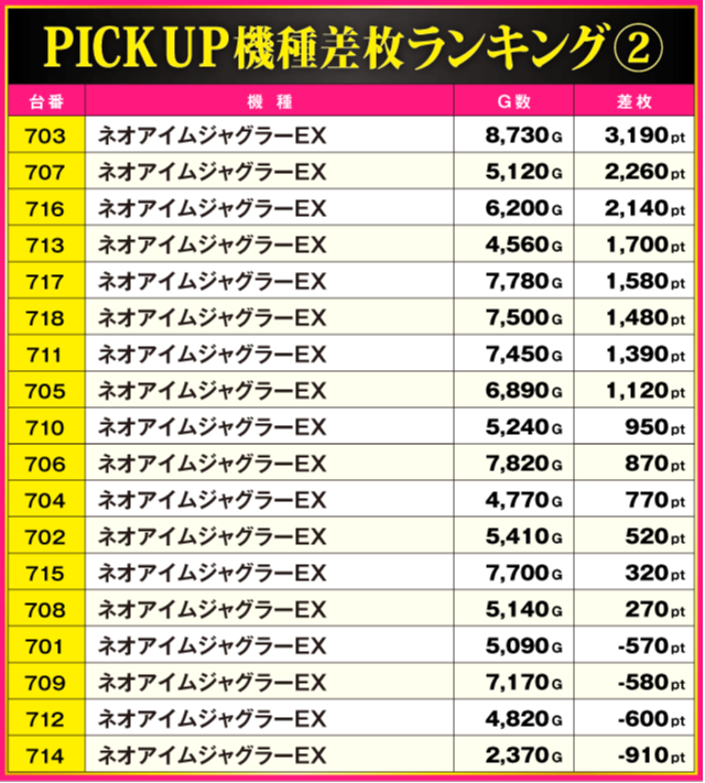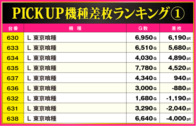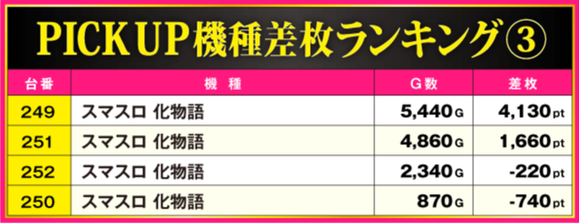 次にPICK UP機種の状況をチェックしていくと、『L 東京喰種』が+6,190pt、『スマスロ 化物語』が+4,130ptを叩き出している。また、『ネオアイムジャグラーEX』からも多数の好調台が確認されており、最終的にプラス差枚で実戦を終えた台が大量発生しファンを喜ばせていた。