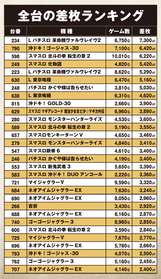 『Lパチスロ 革命機ヴァルヴレイヴ2』234番台が+7,300ptで首位を獲得。そこに『沖ドキ!ゴージャス-30』790番台が+6,420pt、『スマスロ 北斗の拳 転生の章2』598番台が+6,220ptでつづく。さらに『スマスロ 化物語』249番台の+5,420pt、『Lパチスロ 革命機ヴァルヴレイヴ2』223番台の+5,290ptなど、ハイレベルなptがズラリと並ぶ見事なランキングとなっていた。