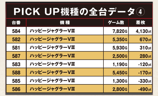 584番台が+4,130ptをマークしたのを始め、半数の4台がプラスに。マイナスだった台も僅差の惜敗だった。