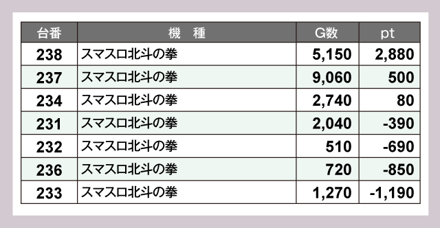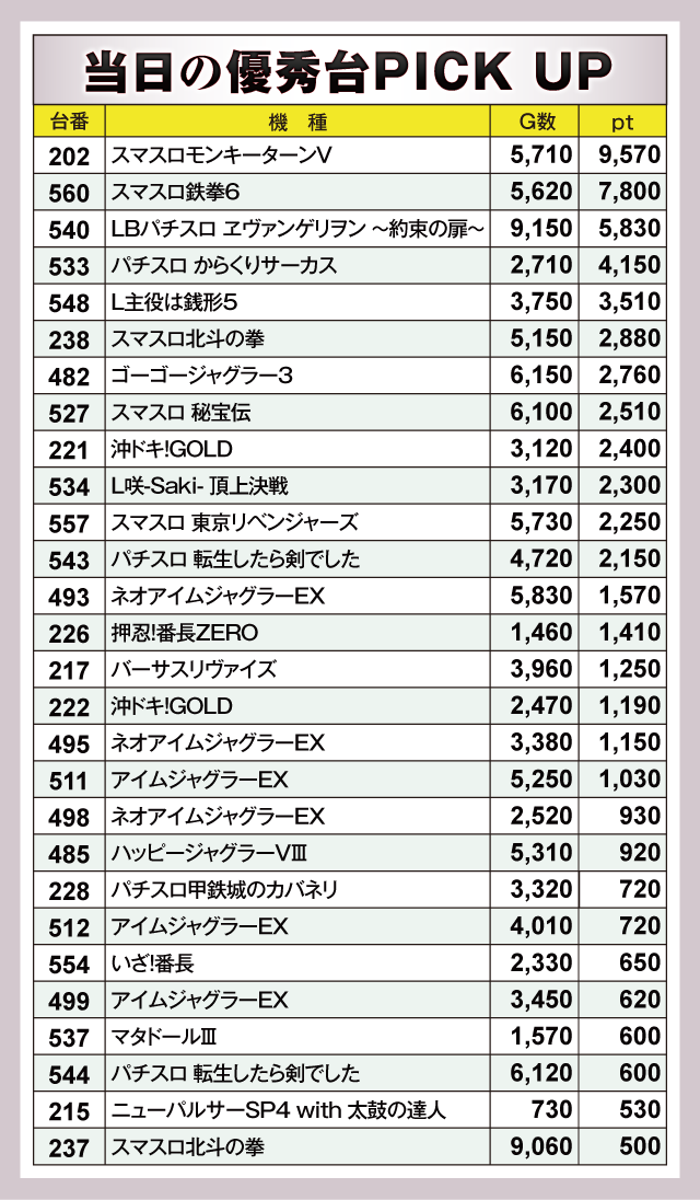 『スマスロモンキーターンV』202番台が、+9,570ptでおしくも1万pt到達ならず。『スマスロ鉄拳6』560番台が+7,800ptでそれにつづいていた。そして『LBパチスロ ヱヴァンゲリヲン ~約束の扉~』540番台が+5,830pt、『パチスロ からくりサーカス』533番台が+4,150ptで並ぶ。さらに『L主役は銭形5』548番台の+3,510pt、『スマスロ北斗の拳』238番台含む7台が2,000ptオーバーなど、優秀台が多数あつまる豪華なデータとなっていた。