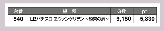 1台のみ設置の『LBパチスロ ヱヴァンゲリヲン ~約束の扉~』は9,000G超えを果たし、ptの面でも大きな成果をあげている。
