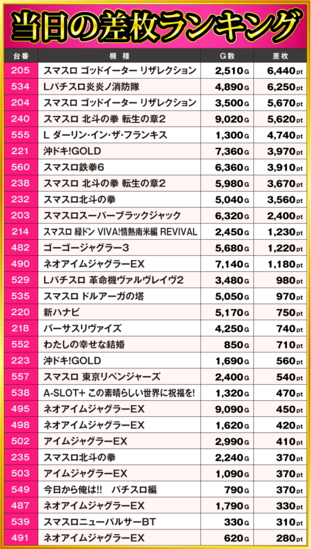 この日は、『スマスロ ゴッドイーター リザレクション』が+6,440pt、『Lパチスロ炎炎ノ消防隊』が+6,250ptを叩き出しプレイヤーの注目を集めていた。さらに、話題の新台『スマスロ 北斗の拳 転生の章2』から+5,620ptが飛び出すなど、新旧を問わず様々な機種でハイスコアが確認されている。