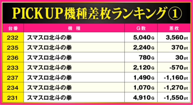 今回のPICK UP機種は『スマスロ北斗の拳』で、232番台が+3,560ptを記録。ゲーム数をしっかりと重ね結果を残している。その他の台も、もう少し粘っていればその実力を引き出せた可能性があっただけに、少々悔やまれるところではある。