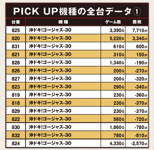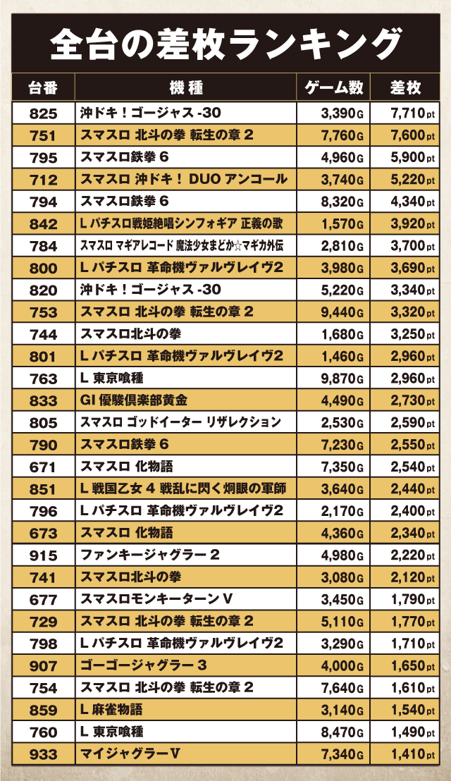『沖ドキ!ゴージャス-30』と『スマスロ 北斗の拳 転生の章2』、メダル機とスマスロからそれぞれ7,000pt超えをマークする台がランキングのワンツーを飾った。3位以降も『スマスロ鉄拳6』を始めとする各種スマスロに加え、『ジャグラー』シリーズからも好調台が飛び出しており、バラエティ豊かなランキングとなった。
