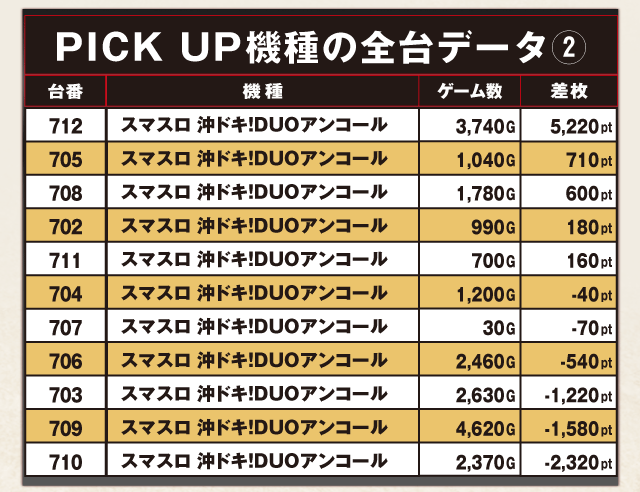 712番台が+5,220ptを叩き出し、全台差枚ランキング4位となる好結果を記録した。