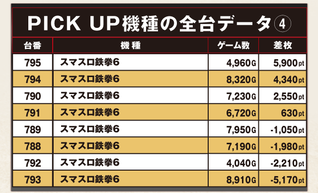 全体的に高い稼働を記録する中、795番台の+5,900ptや794番台の+4,340ptなど4台がプラス差枚を達成。