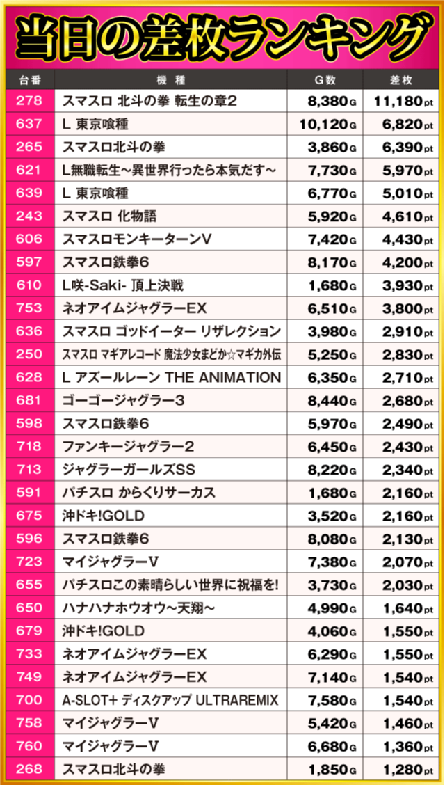 この日は、『スマスロ 北斗の拳 転生の章2』が万枚超の+11,180ptを叩き出しランキングトップに。そのポテンシャルの高さを早くもアピールしプレイヤーの注目を集めていた。また、『スマスロ鉄拳6』からも+4,200ptをはじめ多数の好調台が確認されており、導入直後の新台の活躍が目立つ一日となっていた。