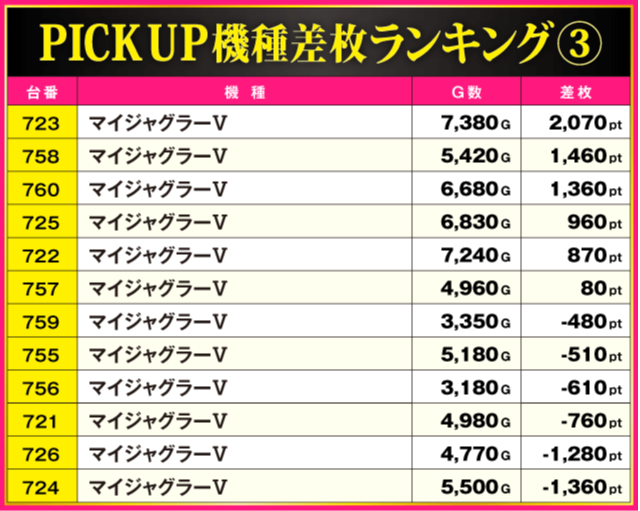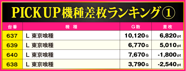 続いてPICK UP機種の状況を見ていくと、『L 東京喰種』は+6,820ptに+5,010ptとハイスコアを連発。さらに、『スマスロ鉄拳6』と『マイジャグラーⅤ』は、どちらも半数の台がプラス差枚で実戦を終える見事な結果を残している。