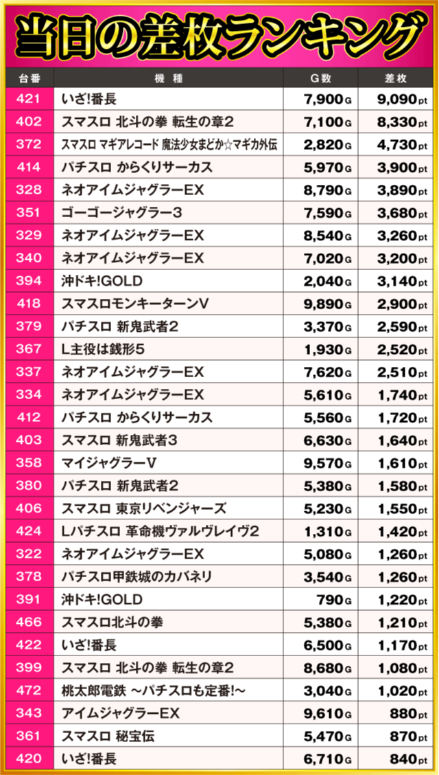この日は、『いざ!番長』が+9,090ptを記録しランキングトップに。次いで、導入直後の新台『スマスロ 北斗の拳 転生の章2』から+8,330ptが飛び出している。また、ジャグラーシリーズからも多数の好調台が確認されており、『ネオアイムジャグラーEX』をメインに差枚TOP30に9台がランクインする盛況ぶりを披露していた。