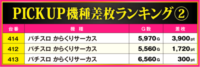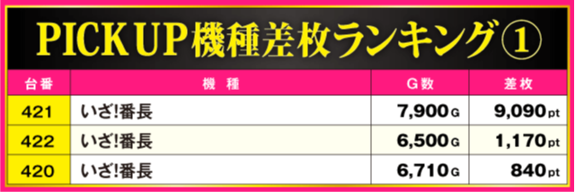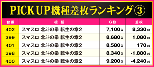 今回のPICK UP機種は全3機種で、ハイスコアが飛び出した『いざ!番長』と『スマスロ 北斗の拳 転生の章2』以外にも『パチスロ からくりサーカス』から+3,900ptが発生。さらに、3機種トータルの全11台中9台がプラス差枚となっているだけに、ファンにとって充実の一日となったのは間違いないだろう。
