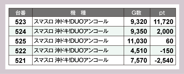 『沖ドキ』シリーズからは『スマスロ 沖ドキ!DUOアンコール』と『沖ドキ!BLACK』をピックアップ。とくに『スマスロ 沖ドキ!DUOアンコール』からは11,000ptオーバーが飛びだすなど、プレイヤーたちの注目を集めていた。