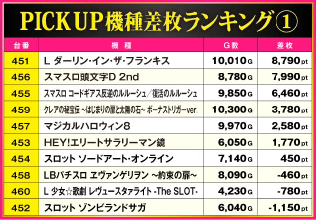 この日、最もプレイヤーの注目を集めたのが『スマスロネオプラネット』で、462番台が万枚目前の+9,130ptを叩き出しランキングトップに。次いで『L ダーリン・イン・ザ・フランキス』が+8,790pt、『スマスロ頭文字D 2nd』が+7,990ptを記録するなど、人気のスマスロを中心にハイスコアが続出し店内を盛り上げていた。