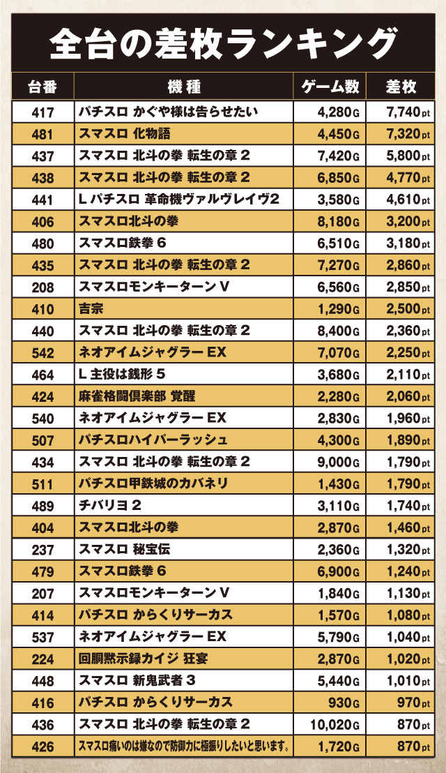 『パチスロ かぐや様は告らせたい』417番台が+7,740pt、『スマスロ 化物語』481番台が+7,320ptと、熾烈な首位争いを繰りひろげていた。そして『スマスロ 北斗の拳 転生の章2』437番台が+5,800pt、438番台が+4,770pt、『Lパチスロ 革命機ヴァルヴレイヴ2』441番台が+4,610ptでそこに連なる。さらに『スマスロ北斗の拳』406番台の+3,200ptなどなど、優秀台満載のランキングが出来あがっていた。