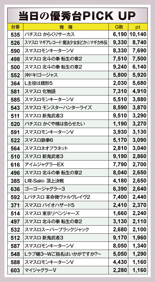 『パチスロ からくりサーカス』535番台が+10,140ptと、この日唯一の1万ptを達成していた。そこに『スマスロ マギアレコード 魔法少女まどか☆マギカ外伝』526番台が+8,740ptでつづく。さらに『スマスロモンキーターンV』590番台が+7,690pt、『スマスロ 北斗の拳 転生の章2』498番台が+7,500pt、500番台が+6,140ptを記録。以下『沖ドキ!ゴージャス』552番台の+5,920ptなどなど、見応えのあるデータが多数並んでいた。