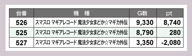 『スマスロ 新鬼武者3』はかなりの高稼働でptも上々。『スマスロ マギアレコード 魔法少女まどか☆マギカ外伝』も稼働が高い2台が結果をのこしていた。