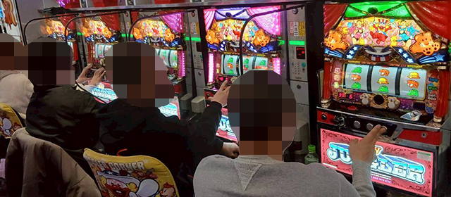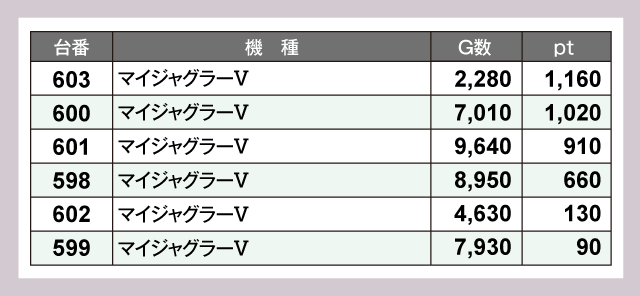 定番の『マイジャグラーⅤ』と『スマスロモンキーターンV』はいずれも人気で、とくに『マイジャグラーⅤ』は6台すべてがプラスptとバツグンの安定感を発揮していた。