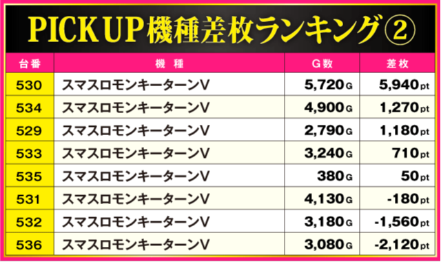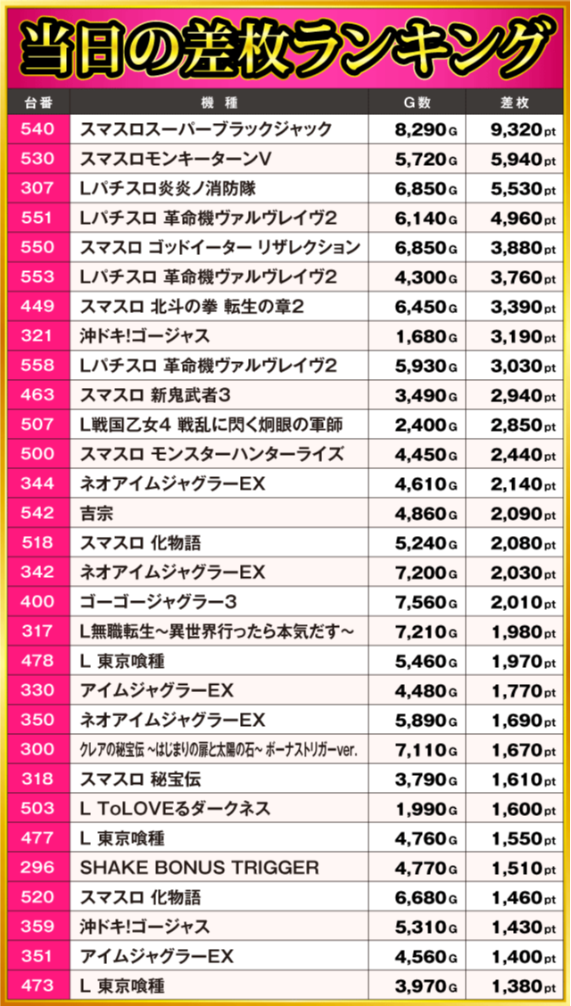 この日は、『スマスロスーパーブラックジャック』の540番台が+9,320ptを叩き出しランキングトップに。次いで『スマスロモンキーターンV』の530番台が+5,940ptを記録するなど、台番号末尾0の台で多数の好調台を確認。最終的に差枚TOP30に末尾0の台が9台もランクインしている点は注目すべきポイントと言えるだろう。