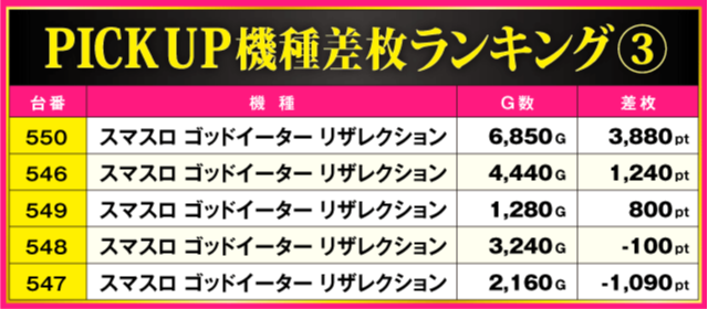 今回のPICK UP機種は全3機種で、ハイスコアが飛び出した『スマスロスーパーブラックジャック』と『スマスロモンキーターンV』以外に『スマスロ ゴッドイーター リザレクション』から+3,880ptが発生。さらに、3機種トータルの全17台のうち半数以上の台がプラス差枚となる見事な結果を残している。