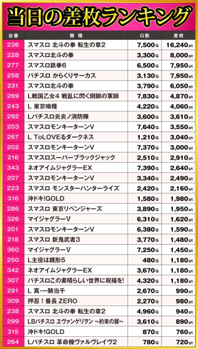 この日は、話題の新台『スマスロ 北斗の拳 転生の章2』が怒涛の+16,240ptを叩き出し堂々のランキングトップに。そのポテンシャルの高さを遺憾なく発揮しプレイヤーの注目を集めていた。また、他にも『スマスロ北斗の拳』から+8,000pt、『スマスロ鉄拳6』と『パチスロ からくりサーカス』から+7,000pt超が飛び出している。