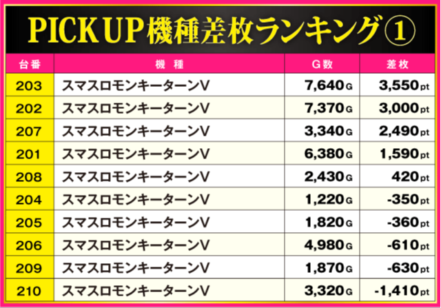 今回のPICK UP機種は、未だ人気の衰え知らずな大ヒット機種『スマスロモンキーターンV』で、203番台が+3,550pt、202番台が+3,000ptを記録。どちらも、ゲーム数は7,000Gを超えており、しっかりと粘って実力を引き出すことに成功している。プレイヤーとしては充実の一日となったに違いないだろう。