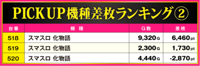 次にPICK UP機種の状況をチェック!! 差枚上位にランクインした『スマスロ 北斗の拳 転生の章2』と『スマスロ 化物語』以外に『ネオアイムジャグラーEX』からも多数の好調台が確認されており、全11台中7台がプラス差枚となる見事な結果を残している。まさに、3機種のファンにとっては大満足の一日となったはずだ。