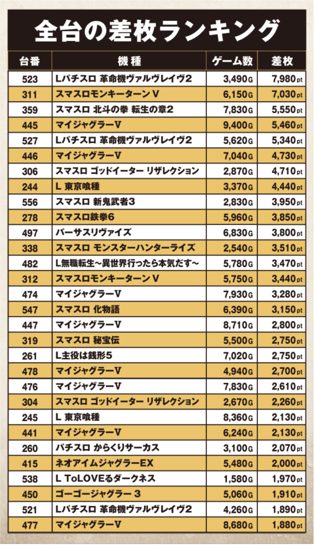 この日は、人気機種を中心にハイスコアが続出。そんな中、『Lパチスロ 革命機ヴァルヴレイヴ2』と『スマスロモンキーターンV』が+7,000pt超、『スマスロ 北斗の拳 転生の章2』と『マイジャグラーⅤ』が+5,000pt超を叩き出している。機種のタイプや新旧を問わず広範囲に渡ってチャンスが潜んでいたのは間違いないだろう。